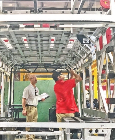 在位于美國加州蘭卡斯特市的比亞迪大巴工廠里,工作人員正在檢查設(shè)備。郜夢(mèng)日攝