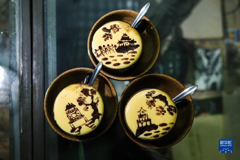 這是2023年7月22日在越南河內(nèi)一家咖啡店拍攝的繪制河內(nèi)風(fēng)光圖案的雞蛋咖啡。越南特色飲品雞蛋咖啡由蛋黃、糖、煉乳和咖啡等原料制成,其獨(dú)特的風(fēng)味受到當(dāng)?shù)孛癖姾屯鈬慰拖矏邸?/p>