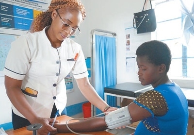 穆薩烏(左)為一名當?shù)卦袐D測量血壓。本報記者 黃煒鑫攝