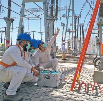 在巴基斯坦默蒂亞里—拉合爾直流輸電項(xiàng)目現(xiàn)場,中巴工程師對(duì)設(shè)備開展日常檢修。本報(bào)巴基斯坦分社 薩義德·邁赫迪攝