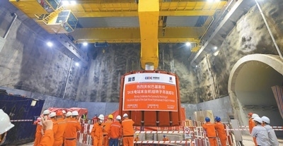 2023年6月10日,工人在巴基斯坦蘇吉吉納里水電站吊裝最后一臺(tái)機(jī)組轉(zhuǎn)子。中國能建葛洲壩海投公司供圖