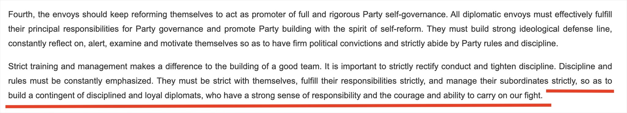 “鐵軍”一詞常見(jiàn)于政府文件或領(lǐng)導(dǎo)人講話(huà),更多的是強(qiáng)調(diào)工作作風(fēng)和紀(jì)律。在近年來(lái)中國(guó)領(lǐng)導(dǎo)人講話(huà)中,曾多次出現(xiàn)“紀(jì)律監(jiān)察鐵軍”“生態(tài)環(huán)境保護(hù)鐵軍”等表述。中國(guó)領(lǐng)導(dǎo)人在接見(jiàn)與會(huì)使節(jié)時(shí)的講話(huà)中說(shuō):“打造一支對(duì)黨忠誠(chéng)、勇于擔(dān)當(dāng)、敢斗善斗、紀(jì)律嚴(yán)明的外交鐵軍?!蓖饨徊烤W(wǎng)站對(duì)這句話(huà)的英文翻譯(見(jiàn)下圖)同樣強(qiáng)調(diào)外交隊(duì)伍的紀(jì)律、責(zé)任和勇氣。作為通行做法,世界各國(guó)對(duì)本國(guó)外交人員都有著很高的紀(jì)律要求。
