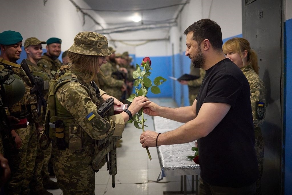 當(dāng)?shù)貢r(shí)間2023年9月4日,頓涅茨克地區(qū),烏克蘭總統(tǒng)弗拉基米爾·澤連斯基(右)在視察前線指揮所,并送女兵玫瑰花。