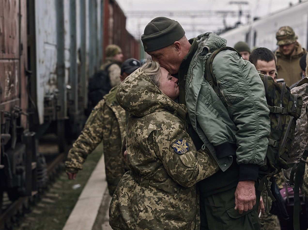 當(dāng)?shù)貢r(shí)間2023年3月29日,頓涅茨克地區(qū)克拉馬托爾斯克,一名即將去前線的烏克蘭女兵在火車站與丈夫分別。