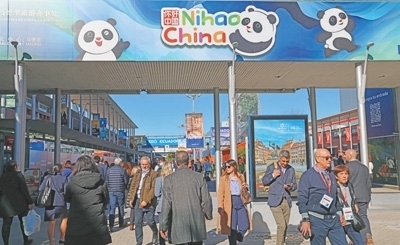 會(huì)展中心外側(cè)主通道的顯著位置,印有“你好!中國(guó)”國(guó)家旅游形象圖案的廣告牌。 本報(bào)記者 許海林?jǐn)z