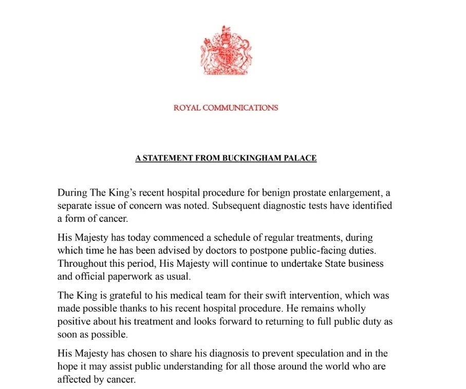 當(dāng)?shù)貢r(shí)間2月5日,白金漢宮發(fā)布消息稱,英國國王查爾斯三世在醫(yī)院的診斷檢查中被確診患有癌癥。