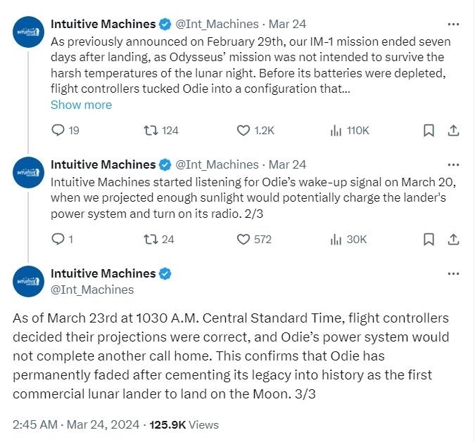 “經(jīng)過數(shù)天等待,已確認(rèn)‘奧德修斯’電力系統(tǒng)已不能支持它再次完成通信,”聲明寫道?!斑@證實(shí)‘奧德修斯’作為首個(gè)由私營企業(yè)發(fā)射的月球著陸器永久休眠?!?/p>