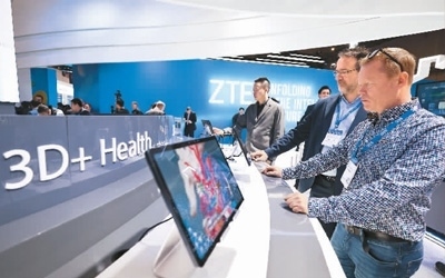 2月28日,西班牙巴塞羅那舉行的2024年世界移動通信大會上,一名參觀者在中興展臺體驗(yàn)全新升級的5G+人工智能裸眼3D平板電腦。新華社記者 高 靜攝