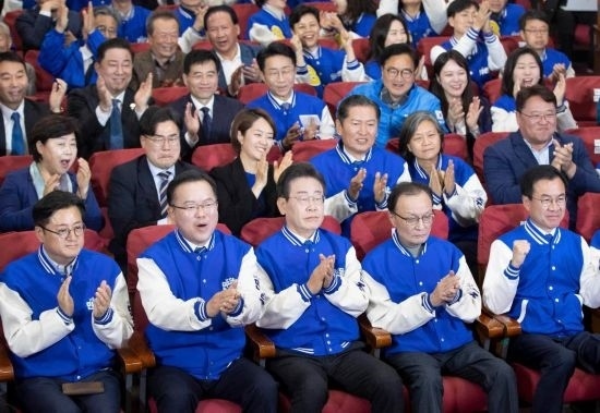 4月10日,在韓國(guó)首爾,韓國(guó)最大在野黨共同民主黨黨首李在明(前排中)與共同民主黨領(lǐng)導(dǎo)層共同慶祝出口民調(diào)結(jié)果大幅領(lǐng)先。新華社記者姚琪琳攝