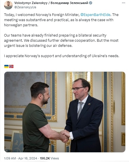 澤連斯基15日在其官方社交平臺上表示,“我們已經(jīng)完成了(烏克蘭和挪威的)雙邊安全協(xié)議準(zhǔn)備工作,并討論了進(jìn)一步的防務(wù)合作。最緊迫的問題是加強(qiáng)我們的防空能力。”
