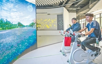 馬斯卡廷中學(xué)學(xué)生(右)體驗VR單車雄安新區(qū)城市漫游項目。