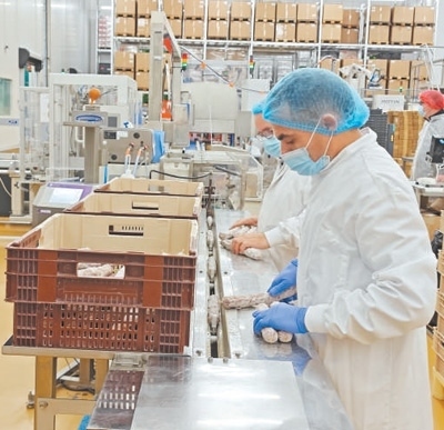 法國(guó)薩高公司香腸包裝車間內(nèi),工人們正在包裝香腸。本報(bào)記者 邢 雪攝