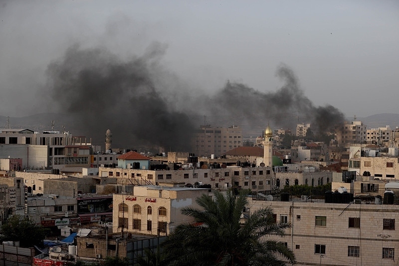 △當(dāng)?shù)貢r(shí)間5月22日,約旦河西岸杰寧難民營(yíng)遭襲后,濃煙滾滾。