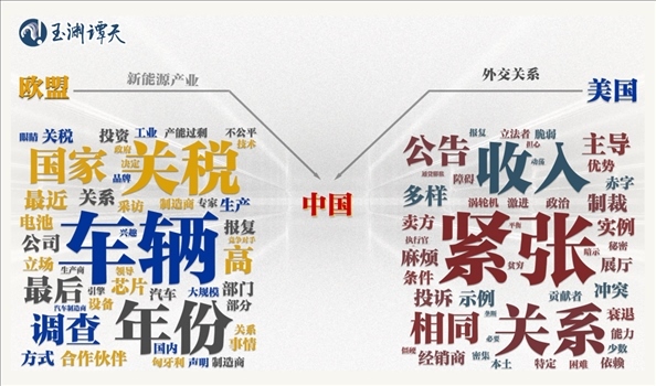 可以看到,以“車(chē)輛”“部門(mén)”“公司”“制造”等詞為代表的關(guān)鍵詞,都指向了新能源行業(yè)。相比之下,美國(guó)媒體對(duì)同一話題的討論,更側(cè)重“緊張”“關(guān)系”“沖突”“政治”等指向外交關(guān)系的關(guān)鍵詞。