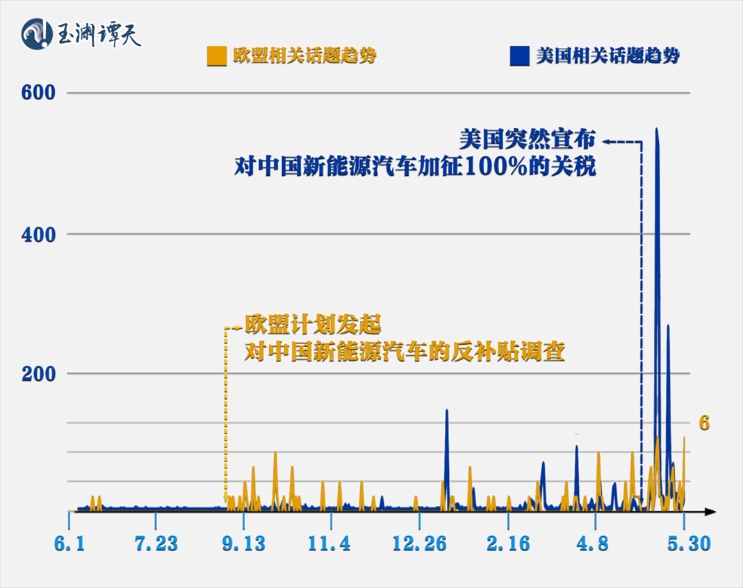 譚主分地區(qū)集納了過(guò)去一年外媒關(guān)于“對(duì)中國(guó)新能源汽車(chē)加征關(guān)稅”的報(bào)道,發(fā)現(xiàn)美國(guó)和歐洲地區(qū)出現(xiàn)了明顯的錯(cuò)峰:
