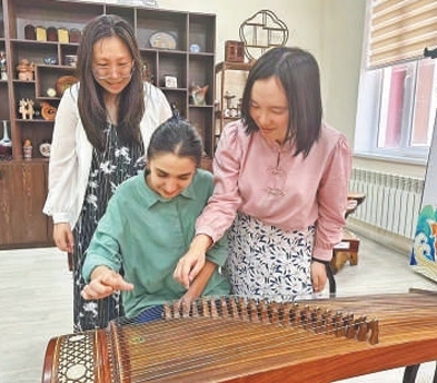 聯(lián)合采訪團(tuán)隊塔方記者在孔子學(xué)院體驗(yàn)古箏。本報記者 顏 歡攝