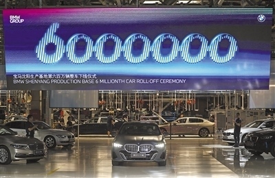 遼寧沈陽市的華晨寶馬汽車有限公司大東工廠,在華晨寶馬第600萬輛整車下線儀式現(xiàn)場,電子大屏幕上“6000000”字樣不停閃爍。新華社記者 潘昱龍攝