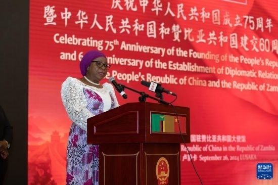 9月26日,贊比亞副總統(tǒng)穆塔萊·納盧曼戈在盧薩卡舉行的慶祝中華人民共和國成立75周年暨中贊建交60周年招待會(huì)上致辭。新華社記者 彭立軍 攝