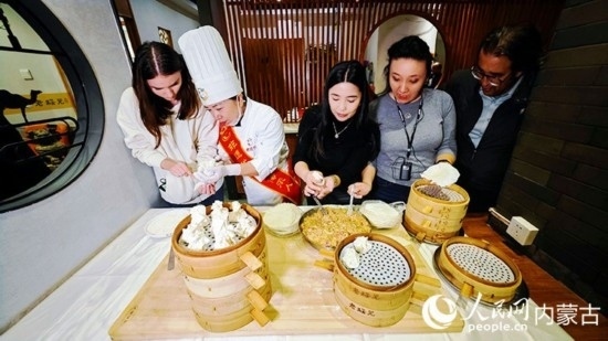 外媒記者體驗(yàn)燒麥制作。人民網(wǎng)記者 張雪冬攝