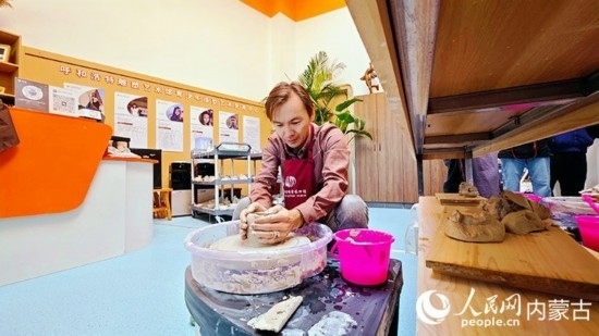 輪盤帶著陶泥緩緩旋轉(zhuǎn),隨著指尖的輕觸,陶泥逐漸被拉高,一塊塊不起眼的泥巴變化出各樣的形態(tài)。10月22日,“一帶一路”青年友好交流項目“外媒看青城”媒體采風(fēng)團在呼和浩特雕塑藝術(shù)館的美育中心進行泥塑和釉下彩體驗,一起“玩泥巴”!