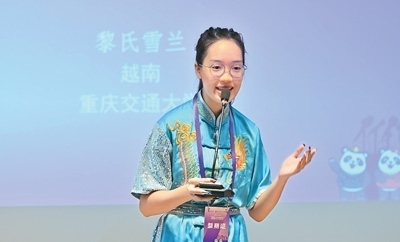 來自越南的黎氏雪蘭來到中國之后,對武術(shù)產(chǎn)生了濃厚興趣。圖為她在比賽現(xiàn)場和大家分享自己學(xué)習(xí)武術(shù)的經(jīng)歷。
