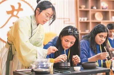 2024年4月15日,2024年“漢語橋”上海合作組織國家青年學生春令營開營儀式在新疆師范大學舉行。來自8個上合組織國家的近500名青年學生參加了此次春令營。圖為參加春令營的來華青年學生在新疆師范大學學生(左)的指導下學習茶藝。