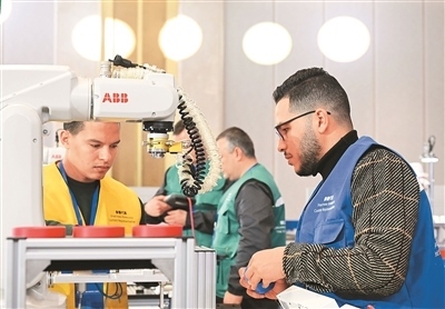 2024年12月18日,第三屆上合組織國家職工技能大賽在青島市開幕。圖為來自埃及的易卜拉欣·穆西·赫爾米·穆西(前右)與穆斯塔法·霍斯尼·穆斯塔法·梅特瓦利(前左)在工業(yè)機器人操作調整工項目比賽中。