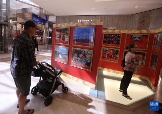1月23日,觀眾在美國(guó)加利福尼亞州奧蘭治縣南海岸廣場(chǎng)觀看“美國(guó)頂尖攝影師旅拍廣東”攝影展。新華社發(fā)(邱晨攝)