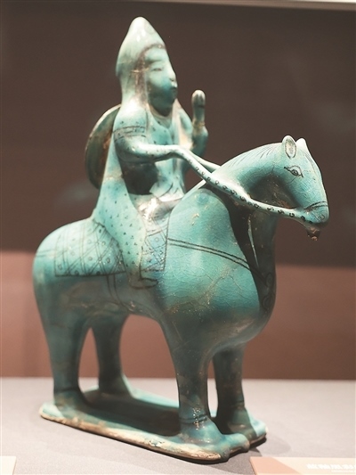 綠松石色釉小型樂隊(duì)模型為公元12—13世紀(jì)的作品,其結(jié)構(gòu)呈方形,表現(xiàn)了樂隊(duì)演奏或宴會(huì)場(chǎng)景,11名樂手分別演奏鐃鈸、鼓、琴、長笛等樂器,場(chǎng)地中央置一果盤。藍(lán)釉黑彩騎士陶塑刻畫了具有東亞特征面孔的騎士形象。騎士頭戴尖頂帽,背負(fù)盾牌,其造型受到中國藝術(shù)的影響。