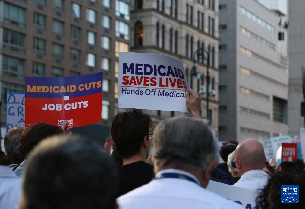 5月1日,人們手持標(biāo)語在美國紐約參加抗議特朗普政府政策的集會(huì)和游行。新華社發(fā)(郭克攝)