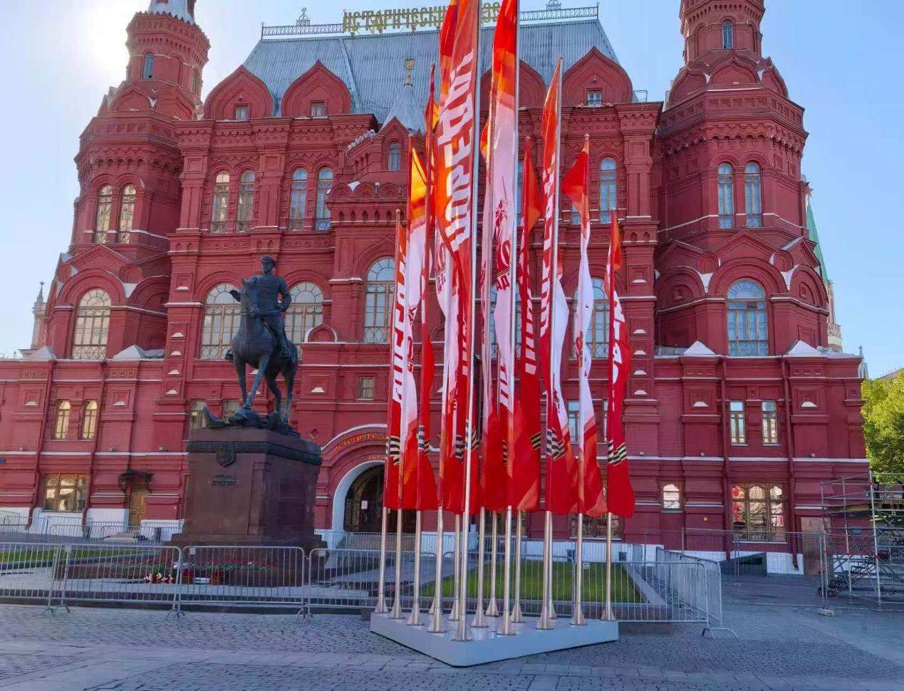 當(dāng)?shù)貢r(shí)間5月6日,俄羅斯國(guó)家歷史博物館前擺放紀(jì)念蘇聯(lián)偉大衛(wèi)國(guó)戰(zhàn)爭(zhēng)勝利80周年慶典旗幟。 鄺西曦 攝