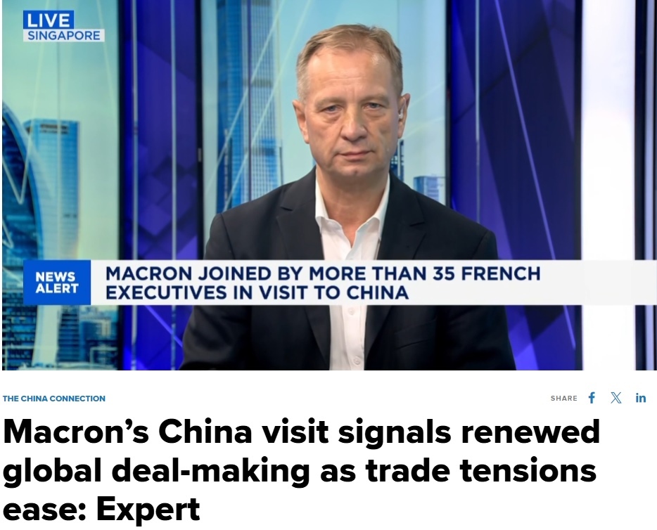 席睿德認(rèn)為,隨著全球貿(mào)易戰(zhàn)強(qiáng)度下降,各國(guó)已逐漸從對(duì)抗轉(zhuǎn)向務(wù)實(shí)合作,紛紛試圖重回正常的貿(mào)易軌道,而馬克龍的訪華正是這一全球趨勢(shì)的重要組成部分。