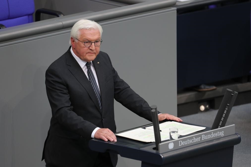 5月8日,德國總統(tǒng)施泰因邁爾在首都柏林國會大廈舉行的紀念活動上致辭。新華社記者杜哲宇攝