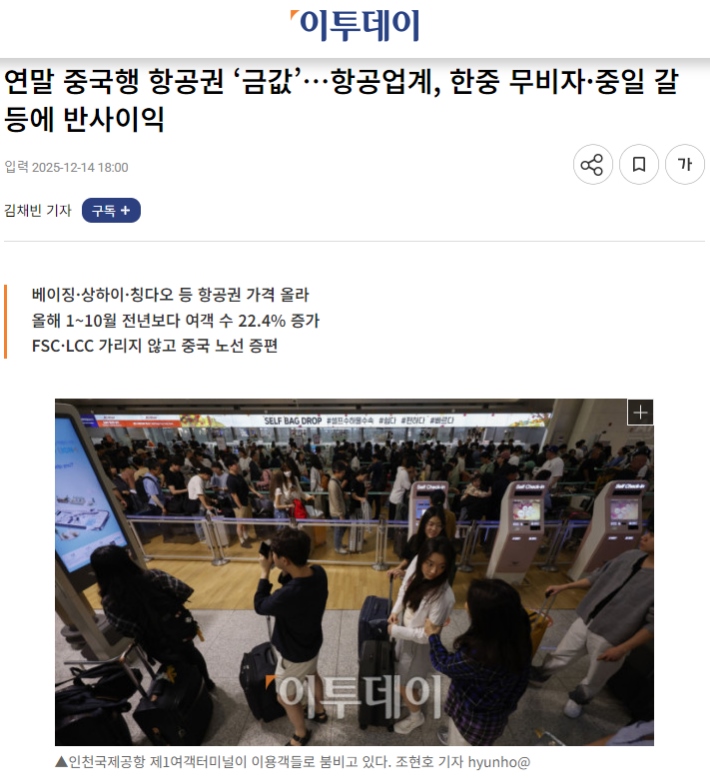 市場旺盛的需求直接傳導至價格層面。韓國《Etoday》近日一篇題為《年底飛往中國的航班“如同黃金般珍貴”》的報道,生動描繪了當前中韓航線的熱度。報道指出,截至12月中旬,韓國飛往北京、上海、青島等主要中國城市的機票價格大幅上漲。例如,大韓航空執(zhí)飛的首爾-上海往返票價已漲至約40萬韓元,濟州航空的韓元-青島航線往返票價也接近30萬韓元。業(yè)內(nèi)分析指出,即便考慮季節(jié)性因素,當前票價仍比去年同期高出約20%。來往中韓“一票難求”,華燈初上的明洞和外灘,熱氣騰騰的烤肉與火鍋,游客們的熱情互動給這個寒冷的冬天帶來暖意。