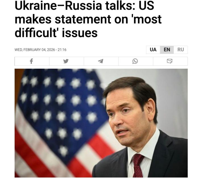 中新網(wǎng)2月5日電 綜合RBC-烏克蘭通訊社等外媒報道,由俄羅斯、美國、烏克蘭三國代表組成的安全問題工作組4日在阿聯(lián)酋首都阿布扎比舉行新一輪會談。美國國務(wù)卿魯比奧表示,會談已取得一定進(jìn)展,但最棘手問題仍未解決。