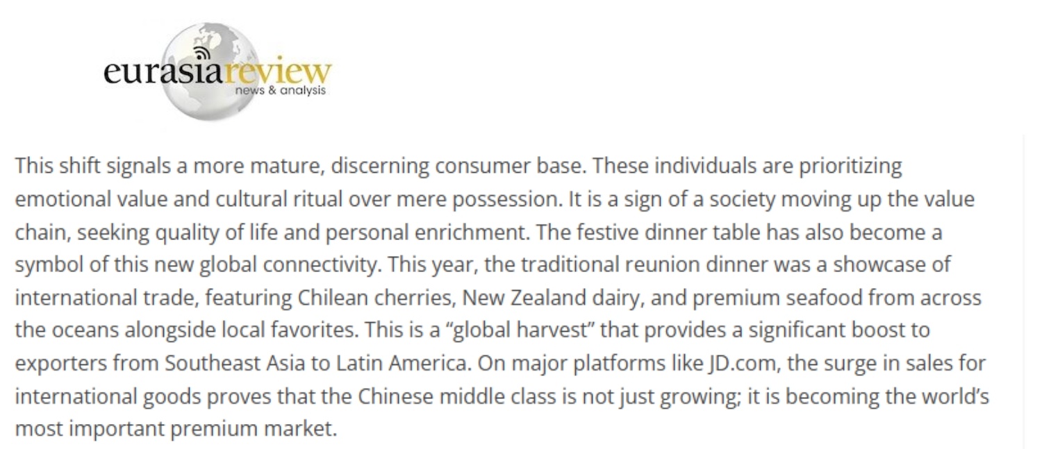 文章稱,這種轉(zhuǎn)變標(biāo)志著中國消費(fèi)者變得更加成熟、更具品位。他們更注重情緒價(jià)值和文化儀式感,而不僅僅是物質(zhì)追求。這象征著社會(huì)正朝著價(jià)值鏈上游邁進(jìn),追求生活品質(zhì)和個(gè)人提升。節(jié)日的餐桌也已成為這種新型全球互聯(lián)的象征。今年,傳統(tǒng)年夜飯成為國際貿(mào)易的展示窗口:既有智利車?yán)遄印⑿挛魈m乳制品和來自大洋彼岸的優(yōu)質(zhì)海鮮,也有本地美食。這是一場(chǎng)“全球豐收”,為從東南亞到拉丁美洲的商品出口提供了強(qiáng)大動(dòng)力。在跨境電商平臺(tái)上,國際商品的銷售激增證明了中國正在成為全球最重要的高端消費(fèi)市場(chǎng)。