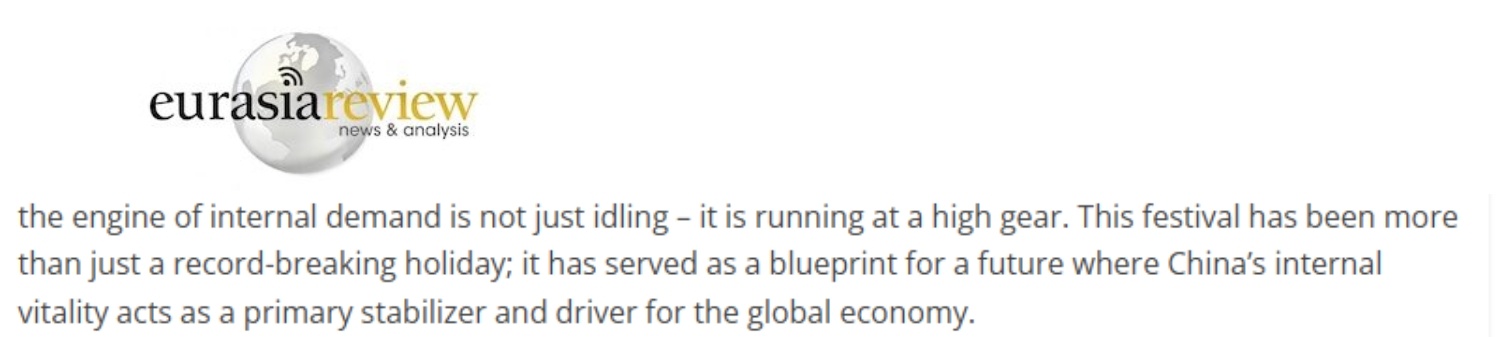 文章最后說,春節(jié)消費(fèi)熱潮表明,內(nèi)需引擎非但沒有空轉(zhuǎn),反而在高速運(yùn)轉(zhuǎn)。這個(gè)春節(jié)的意義不僅僅在于其破紀(jì)錄的假期數(shù)據(jù),而是在于它繪制了一幅未來藍(lán)圖:中國的內(nèi)在活力將成為全球經(jīng)濟(jì)的主要穩(wěn)定器和驅(qū)動(dòng)力。