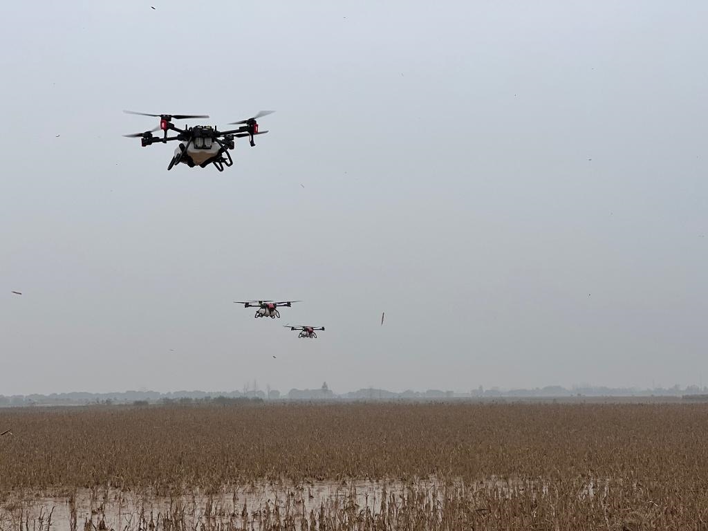 很快,渭南綠盛現(xiàn)代農(nóng)機專業(yè)合作社理事長石宇峰就帶著3臺極飛農(nóng)業(yè)無人機來到地旁,準備作業(yè)。記者看到,農(nóng)業(yè)無人機全程由專業(yè)人員操作,裝種、起飛,按規(guī)劃好的線路和高度在空中播撒,種子沒了再返航續(xù)加,幾個小時就完成了飛播。