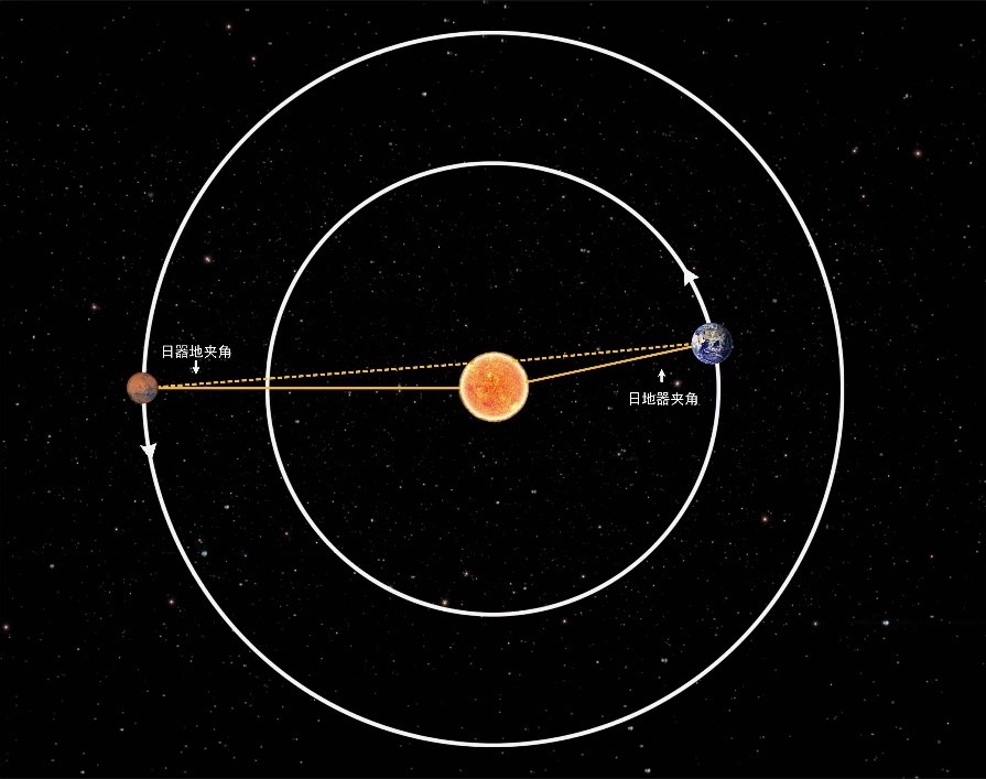 火星日凌期間,地球、火星與太陽之間的位置關(guān)系示意圖。(受訪對象供圖)