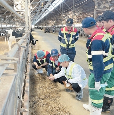 全國人大代表、內蒙古蒙牛乳業(yè)(集團)股份有限公司研發(fā)創(chuàng)新部研發(fā)總監(jiān)史玉東(前排左三)在當地奶牛養(yǎng)殖場調研。全國人大常委會辦公廳聯絡局供圖