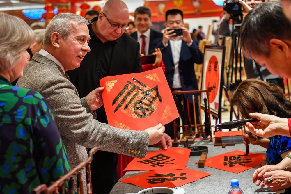 ↑2023年1月20日,來賓在俄羅斯莫斯科舉行的“歡樂春節(jié)—中國文化廟會(huì)”活動(dòng)上接到福字。中俄兩國人文交流日益密切,中俄友好社會(huì)民意基礎(chǔ)愈加穩(wěn)固。