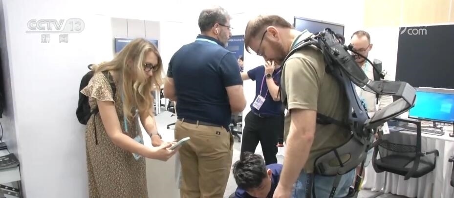 在新設(shè)的工業(yè)自動化及智能制造新展區(qū),一位在剛果(金)經(jīng)營礦場的采購商正在試穿一款外骨骼產(chǎn)品,這款智能設(shè)備可以幫助實現(xiàn)減輕30%到70%的負(fù)重。