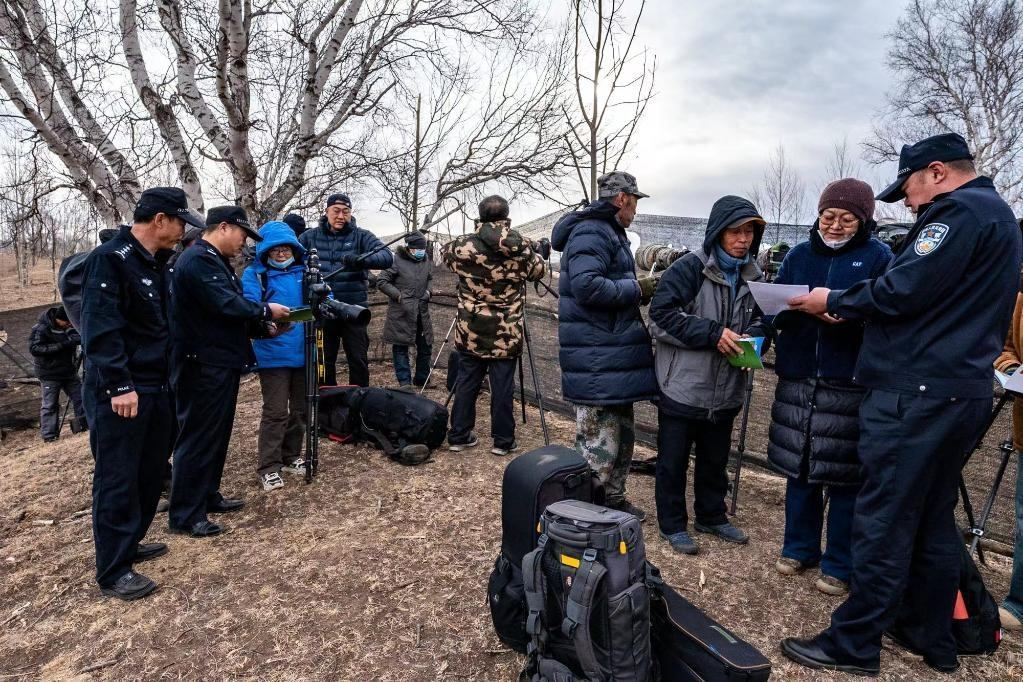 4月17日,民警在向攝影愛(ài)好者宣傳鳥(niǎo)類保護(hù)知識(shí)。(宿海東 攝)