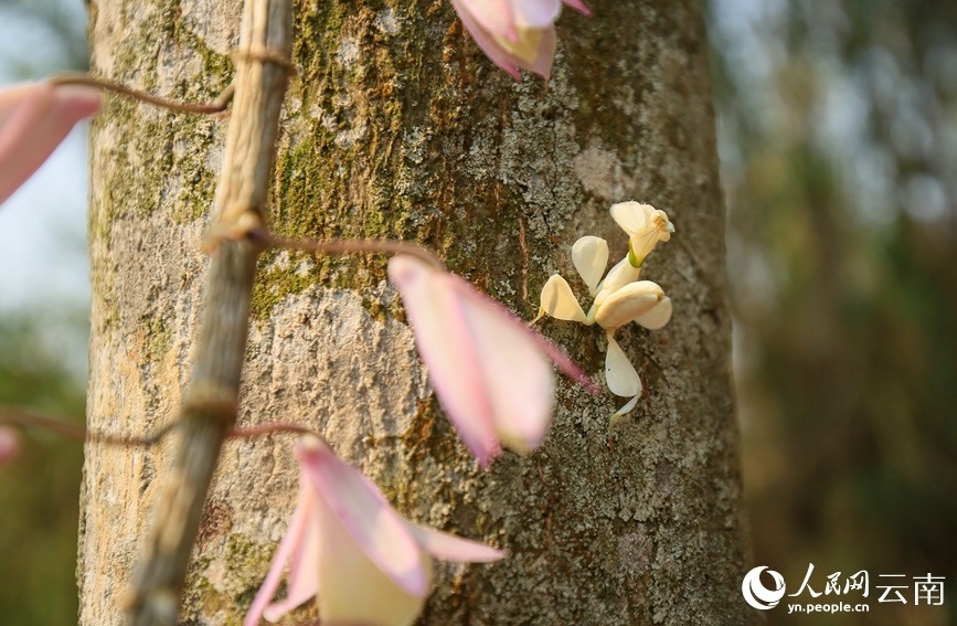 周會蘭介紹,4月12日早上,她吃過早飯后來到自家附近的山上采摘可食用的白花,在一條箐溝旁的樹林陡坡處,她采摘了一些白花后,轉(zhuǎn)身開始撿拾落在草叢中的白花?!巴蝗?,一朵白色的花引起了我的注意,當我伸手去撿時,這朵花竟然自己挪了個位置?!敝軙m說,當時覺得很奇怪,花還會自己動,慢慢才發(fā)現(xiàn)是一只蟲子。