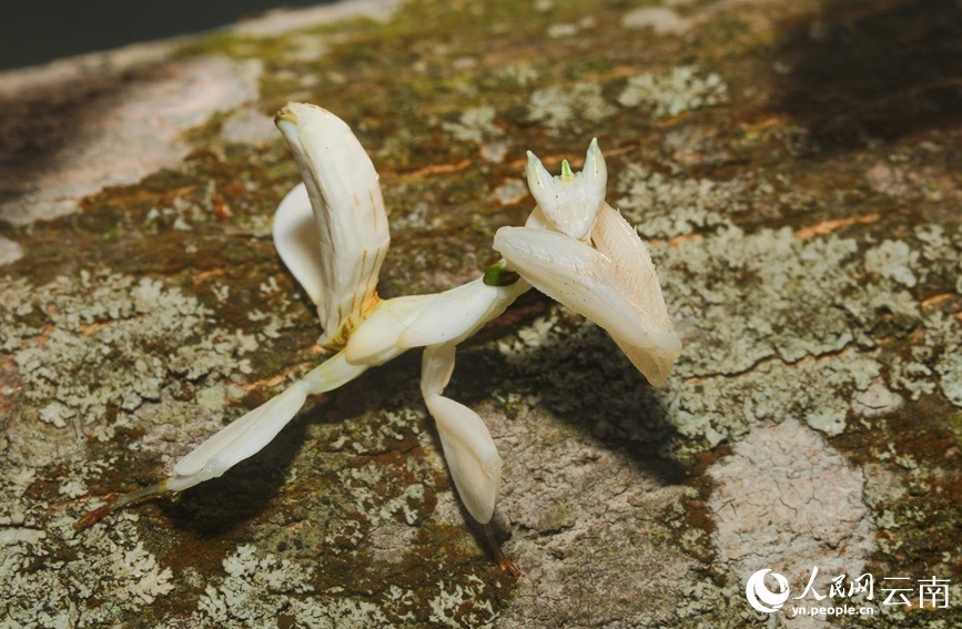 “這只螳螂周身潔白,帶有少量的綠色、棕色,頭部呈三角形,與常見螳螂細長的足部不同的是,這只螳螂的足部寬扁似花瓣,行走起來或停留在林中時,像極了盛開的一朵鮮花?!睏顗粜颜f。