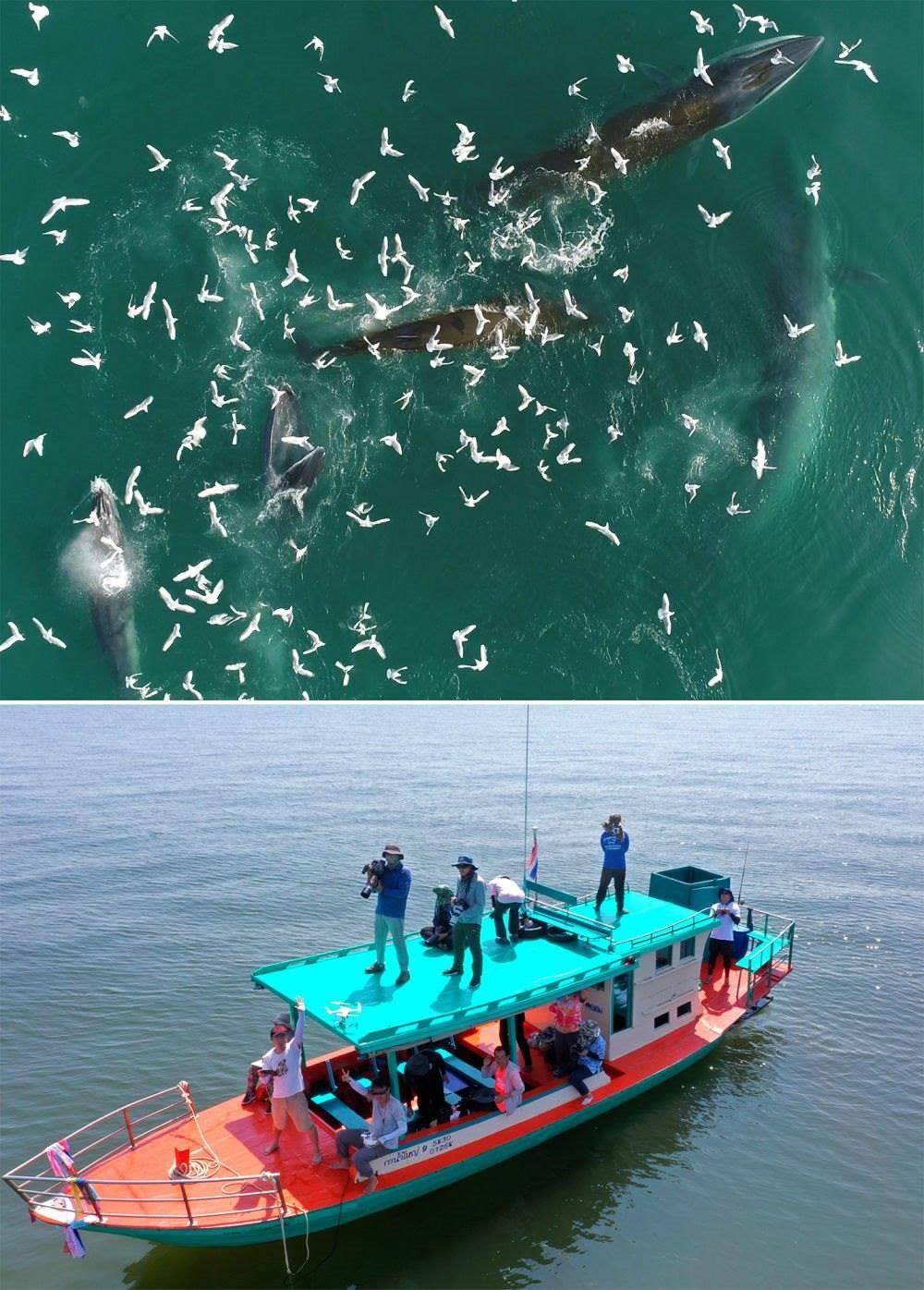 (拼版照片)上圖:布氏鯨在中國廣西潿洲島附近海域捕食(2022年2月22日攝)。下圖:中泰兩國科研人員在泰國灣對布氏鯨進行聯(lián)合調(diào)查(2019年10月25日攝)。中泰兩國科研人員攜手研究保護布氏鯨這個近岸大型鯨類,圍繞布氏鯨調(diào)查技術(shù)、調(diào)查方法以及其他海洋哺乳動物的研究和數(shù)據(jù)處理方法進行交流與合作。