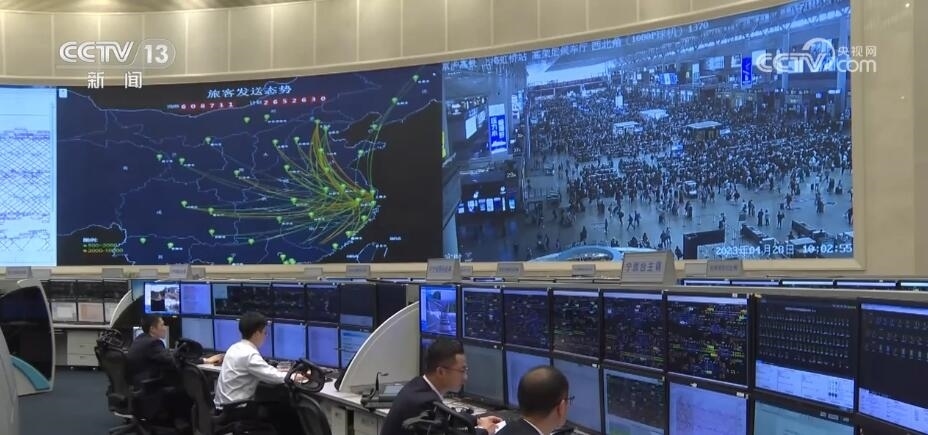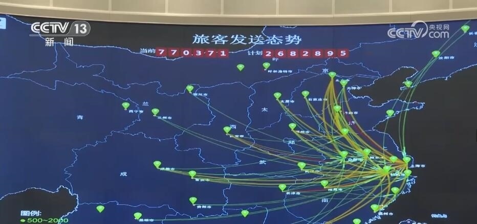 總臺央視記者 鄭連凱:在調(diào)度大廳的屏幕上,我們可以實(shí)時看到包括剛剛采訪的虹橋站在內(nèi),整個長三角地區(qū)740多座車站的客流情況,以及13000多公里鐵路線上列車的運(yùn)行狀態(tài)。而這張圖顯示的是從長三角連通全國各地的干線鐵路的繁忙程度,其中紅色的京滬、滬漢榮、滬昆代表著最繁忙,這里的工作人員可以根據(jù)客票需求隨時調(diào)度,增開臨客列車。