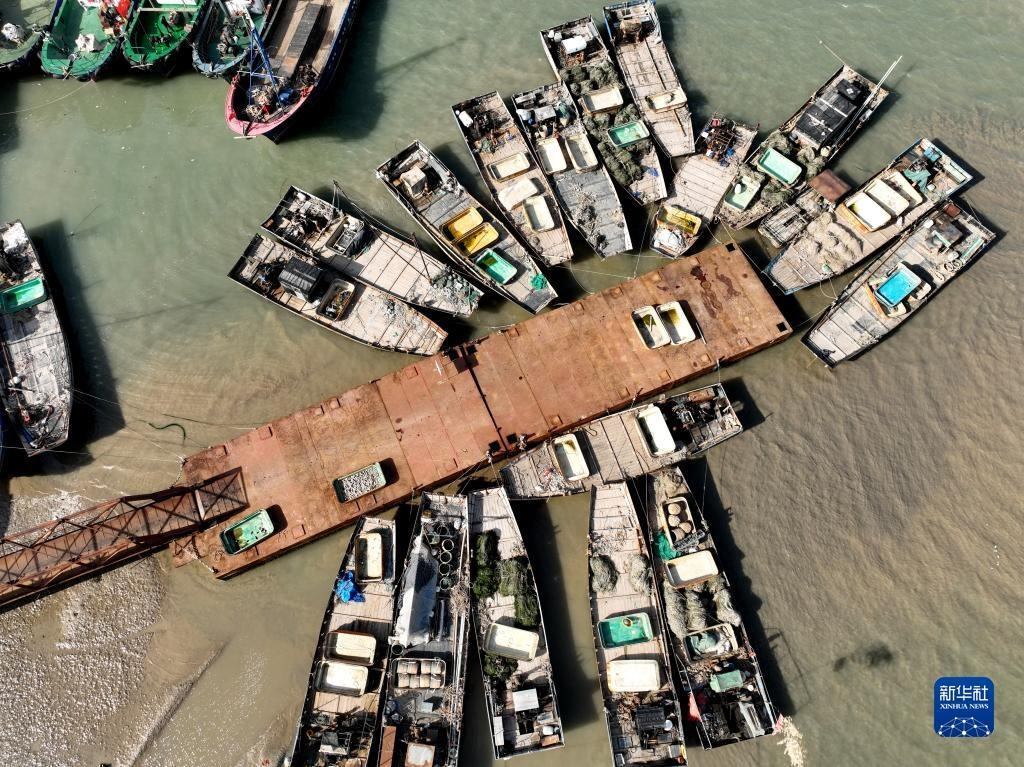 4月30日,在江蘇省連云港市贛榆區(qū)青口漁港碼頭,漁民在卸載漁具,為即將到來的伏季休漁做準備(無人機照片)。