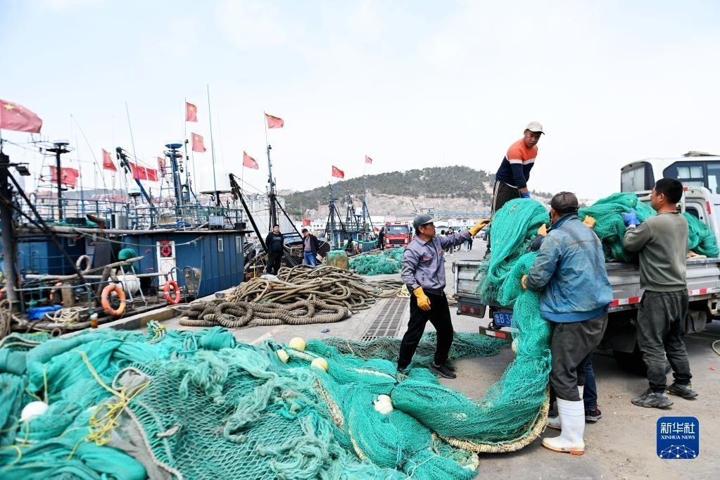 4月30日,在江蘇省連云港市贛榆區(qū)青口漁港碼頭,漁民在卸載漁具,為即將到來的伏季休漁做準備。