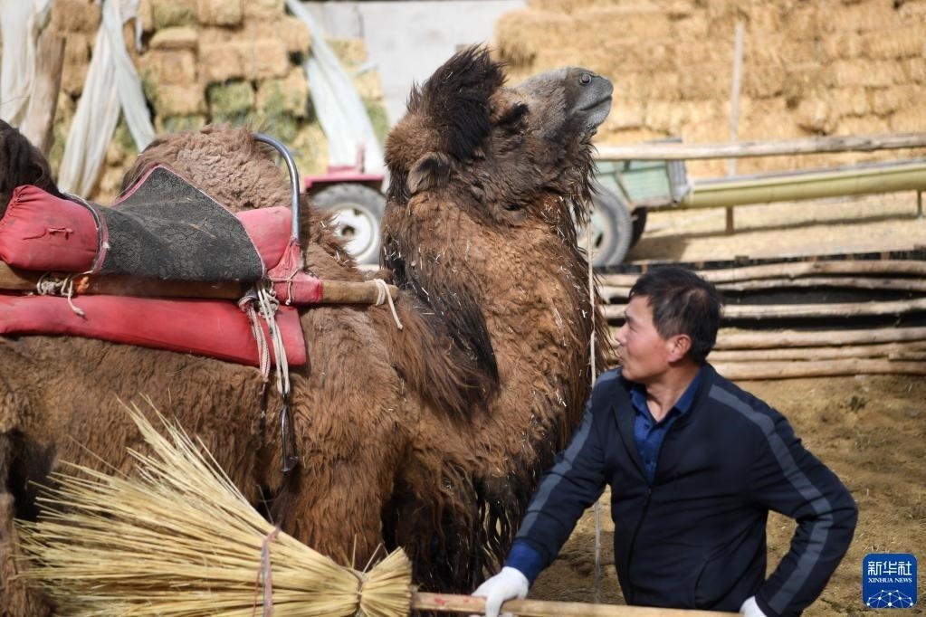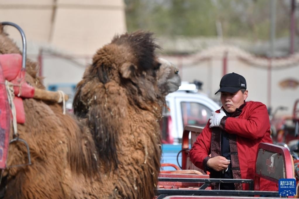 換上景區(qū)工作服的曹文華牽著駱駝準(zhǔn)備“上班”(4月24日攝)。   新華社記者 方欣 攝